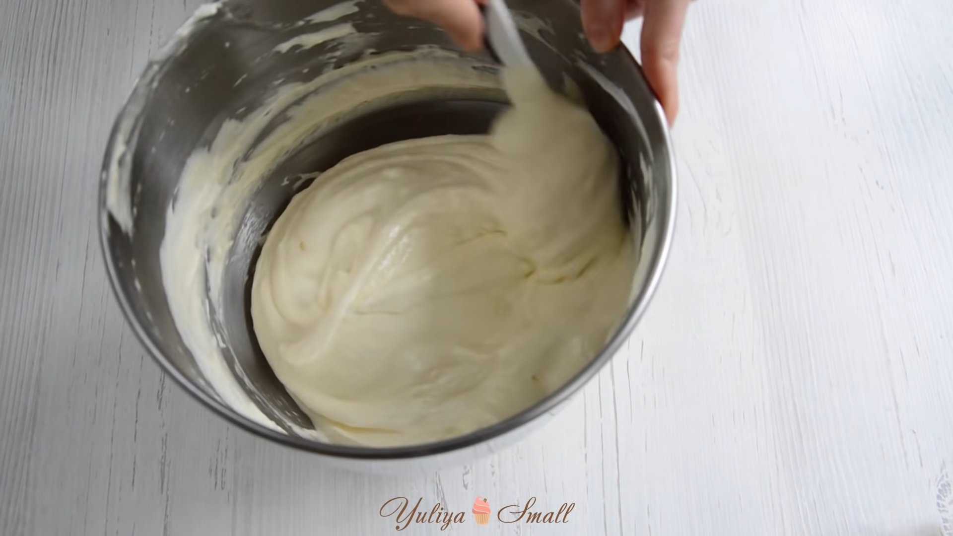 11. Затем добавляем оставшиеся белки и также осторожными круговыми движениями вмешиваем их в тесто. Готовая масса должна иметь густую, но легкую и пышную консистенцию, быть полностью однородной, без комочков и крупинок.