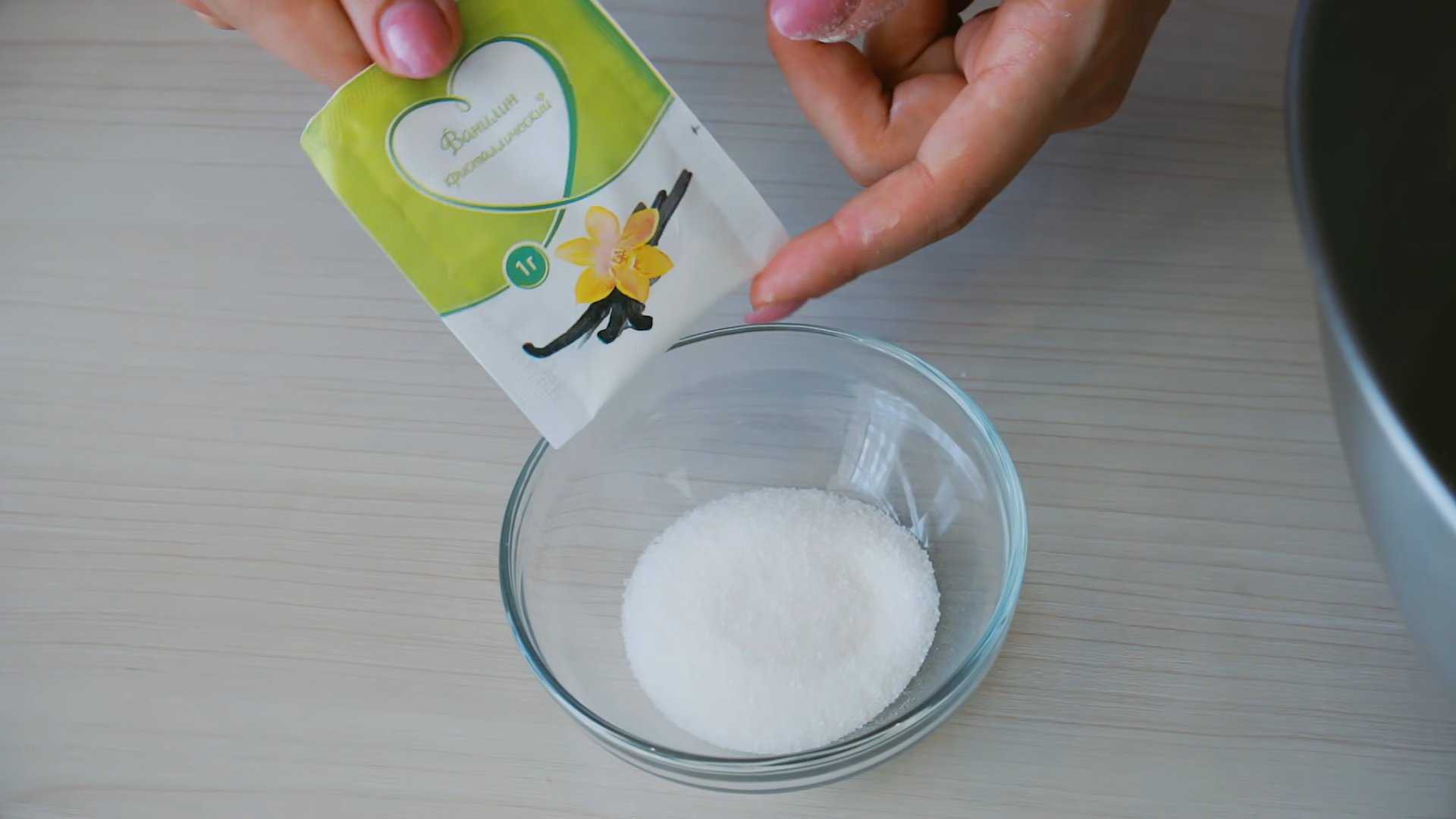Когда белки стали пышными, добавляем сахар с ванилином и продолжаем взбивать на высокой скорости до устойчивых пиков.