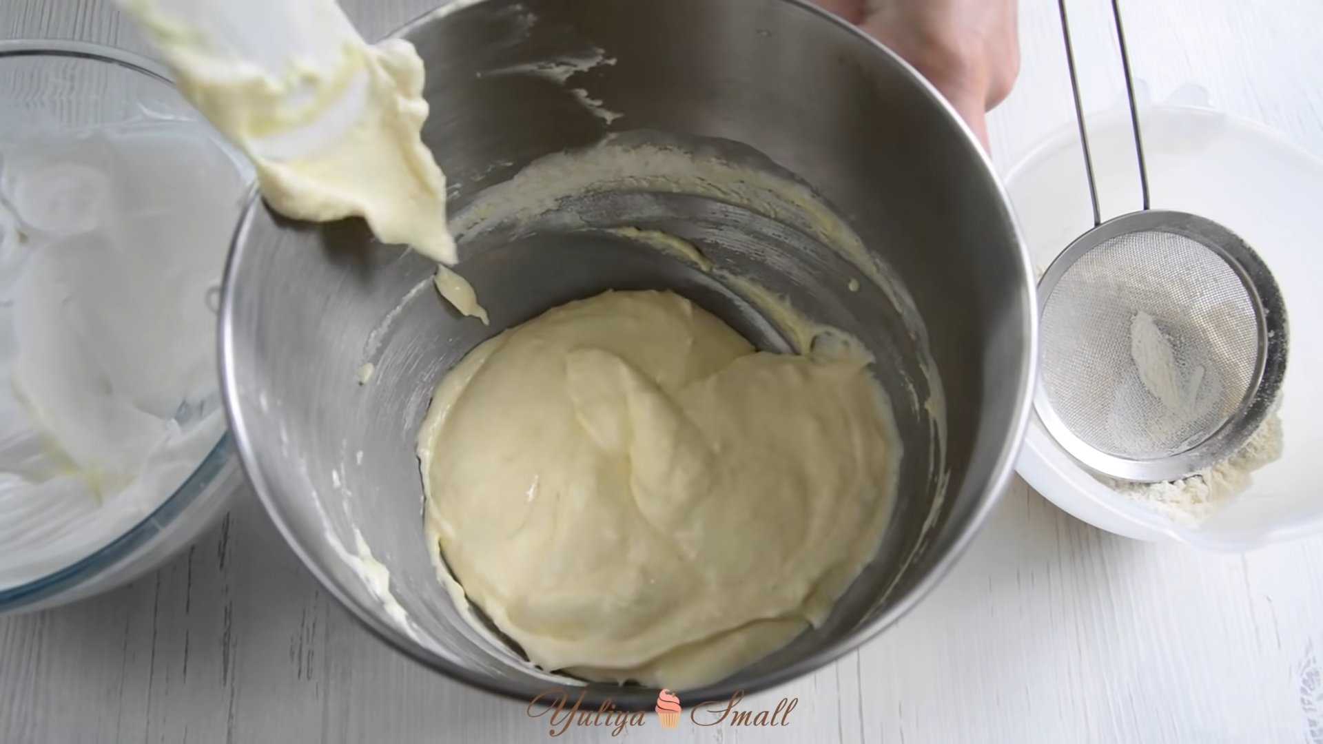 В желтковую массу в несколько этапов вводим взбитые белки. Каждый раз все перемешиваем до однородности.