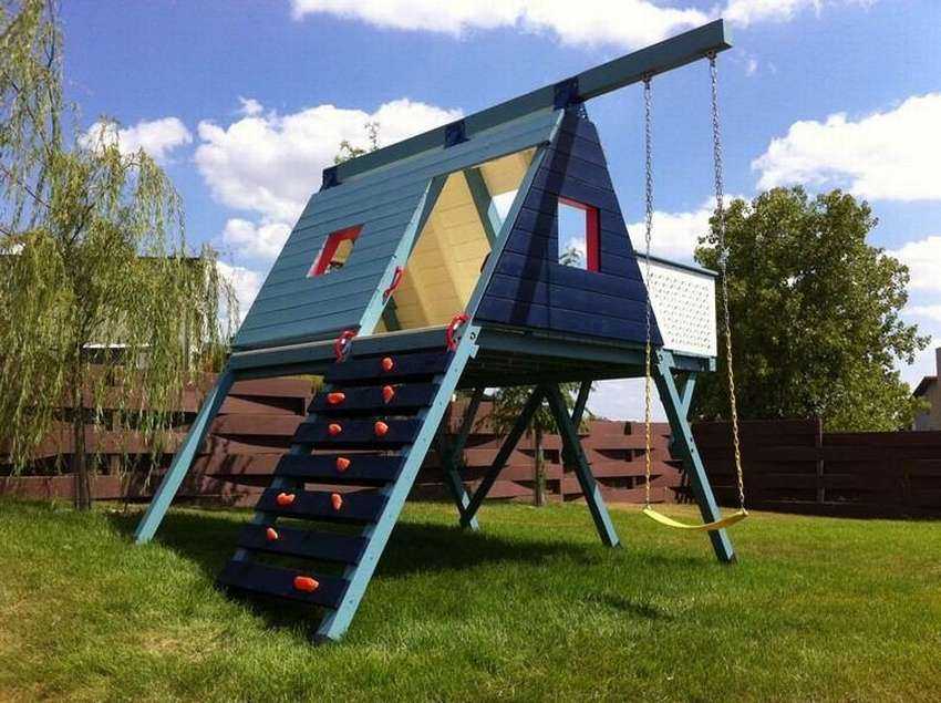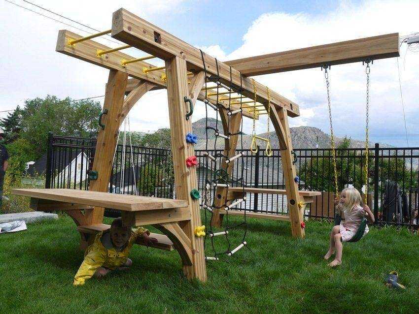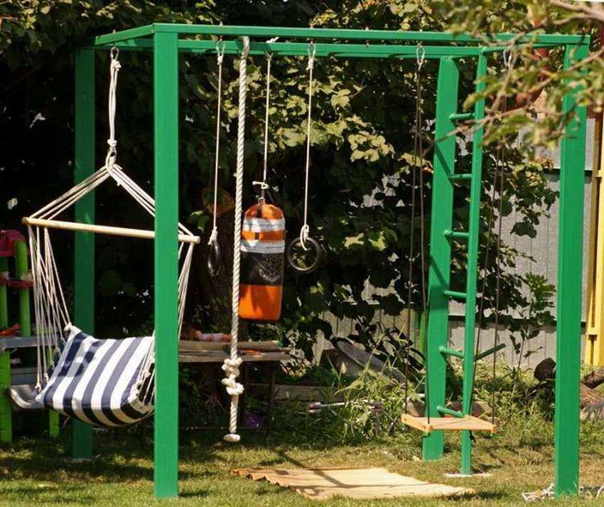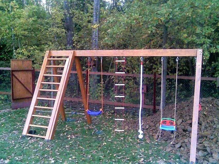 Еще один важный развлекательный элемент – качели. Соответствующее сооружение устраивается:
