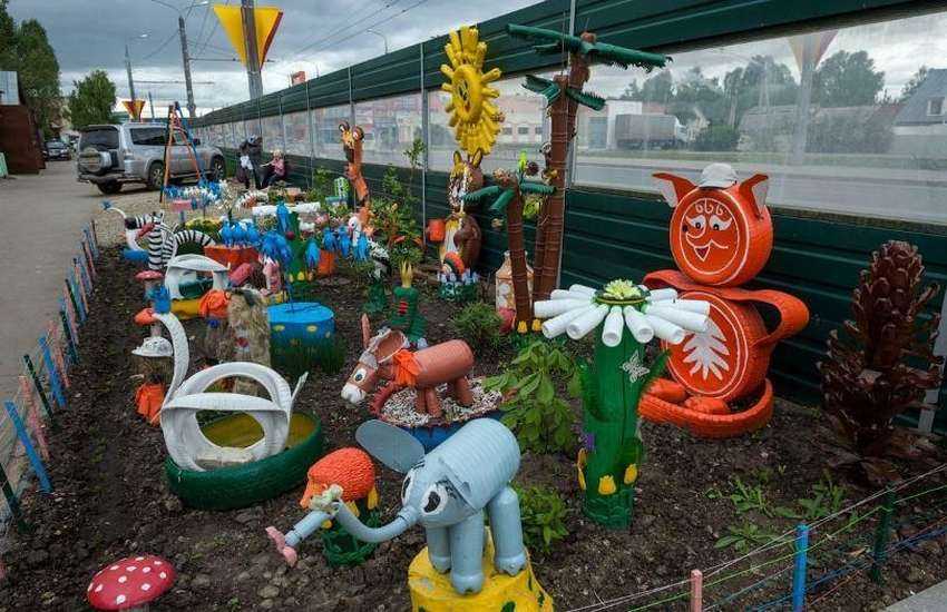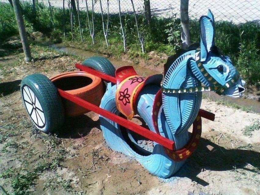 Поделки в виде зверей, автомобиля и других предметов, которые легко сделать из покрышек, брёвен, металлопрофиля. Например, можно изготовить машину из шин для детской площадки, главное, фантазировать или повторять по фото из открытых источников.