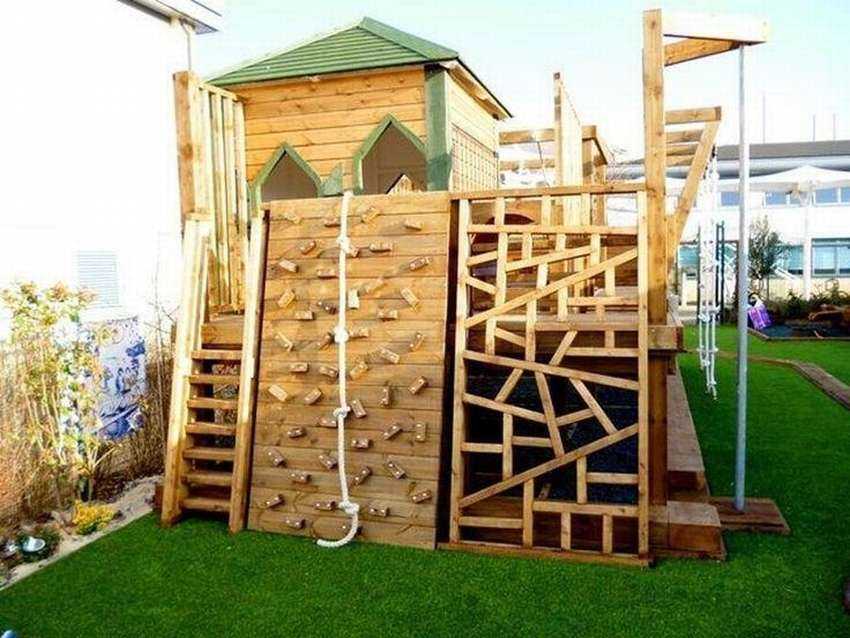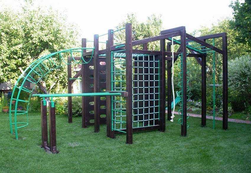 Отдельно горку делают немногие. Чаще всего её строят как часть комплекса с верёвками, лестницами, турниками и т. д.