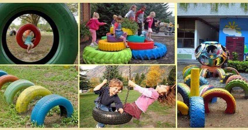 Многие игровые элементы для детской площадки папа и дедушка могут сделать своими руками. Самый популярный материал для таких самоделок — это, конечно, резиновые покрышки. Они долго не портятся и не теряют своих свойств. Покрышки обладают средней жесткостью и оптимальной упругостью. Эти качества обеспечивают их безопасность для детей. Из старых шин можно соорудить качели, маленькую песочницу, дорожку с «кочками», «мишени» для игры с мячом и др. Нет ничего зазорного в использовании покрышек: этот материал безопасен и удобен. А главное — изделие используется повторно, что бережет окружающую среду.