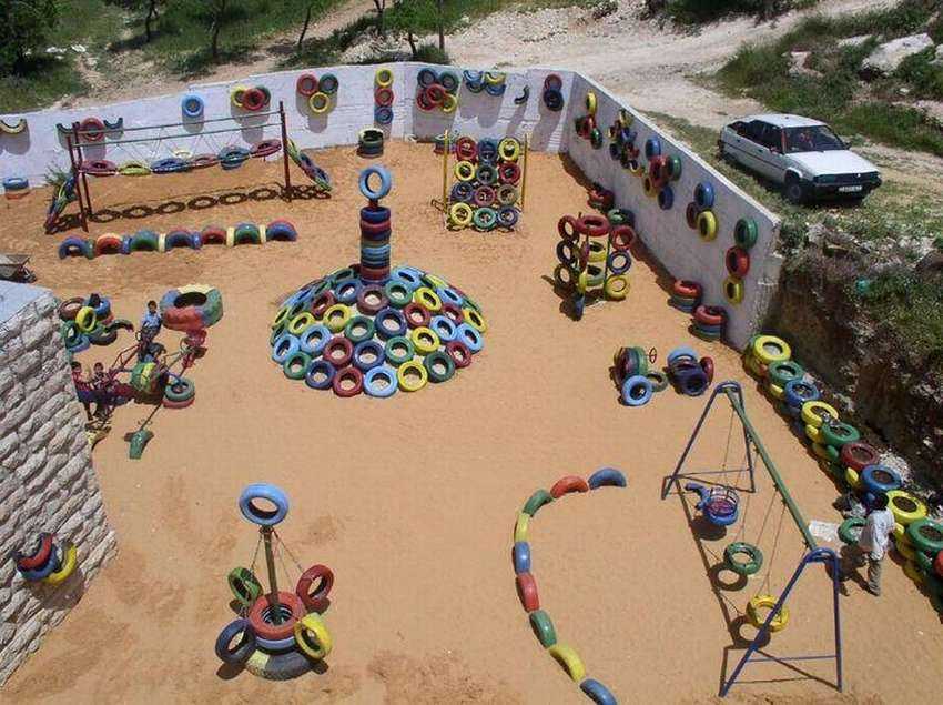 Если детская площадка будет делаться из покрышек, на ней могут быть качели, привязанные к деревьям, клумбы, фигуры животных и даже горки.