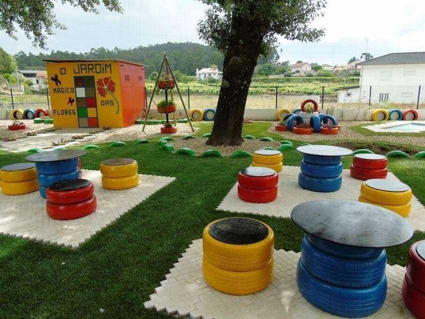 Почти каждый автолюбитель регулярно сталкивается с необходимостью обновлять шины. А что делать со старыми? Если у вас есть дача, старые шины найдут достойное применение. Мнение по поводу таких площадок из автомобильных шин разделились. Некоторые считают, что шины выделяют различные вещества, которые противопоказаны детям. Мы считаем такие страхи сильно преувеличены. Однако решать вам. Для надёжности можно шины покрыть лаком или безопасной краской. Идеи, которые возникли из круглых автомобильных покрышек впечатляют!