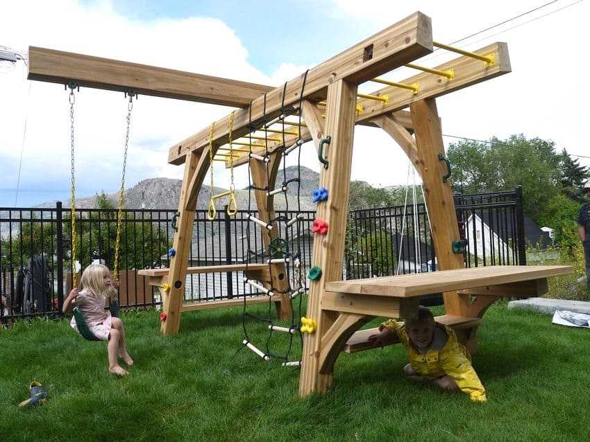 Следующий элемент – качели. В этом моменте никаких сомнений нет. О качелях мечтает каждый ребёнок.