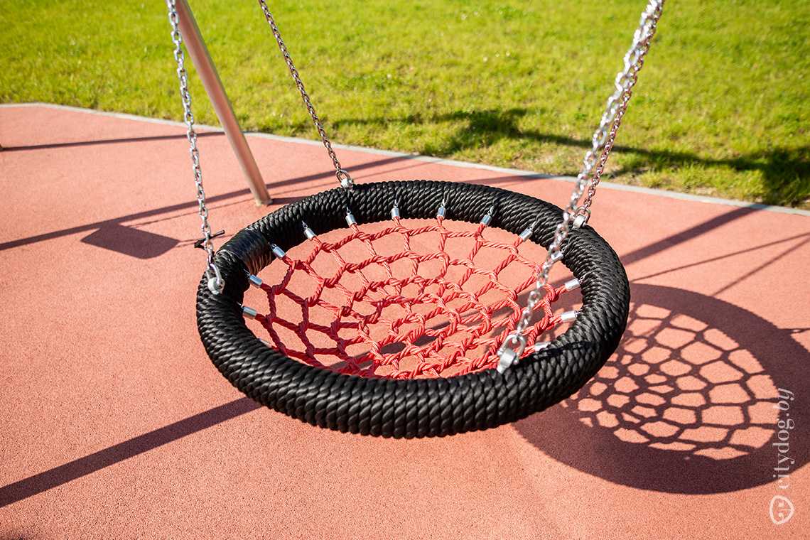 В Новой Боровой есть несколько видов качелей-гнезд. Это классическая модель, плетеная. В других кварталах установлены модульные системы из композитного пластика. Разница между ними заключается в весе, а значит, и в инерции. Например, если классическая модель случайно «прилетит» вам по ноге, это будет очень ощутимо. Но многим нравится ее дизайн.