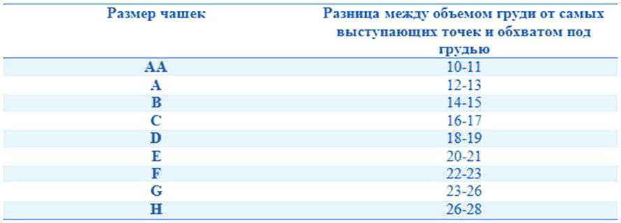 Таблица 2. Чашечки и разница между обхватами груди