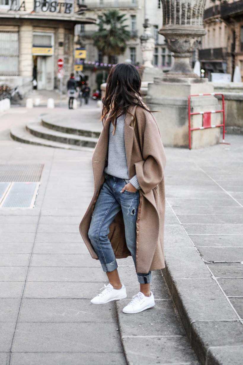 - Для ежедневных прогулок по городу лучше всего подобрать пальто классического кроя и объединить его в образе с объемными бойфрендами, джинсами скинни или рваными моделям. Обувь выбирают в зависимости от индивидуальных предпочтений и выбранного фасона джинсов. Например, к узким штанам подойдут высокие сапоги, а к рваным моделям – практичные кроссовки.