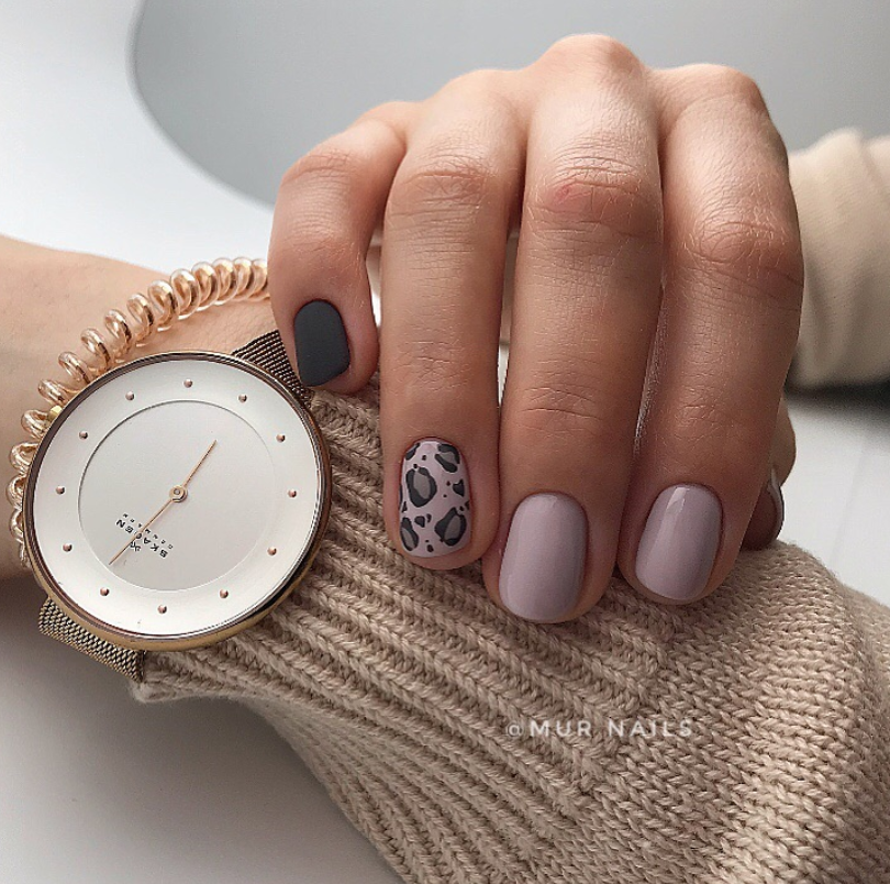 Вторым вариантом окрашивания предстает однотонный дизайн оттенков серого, черного, винного, палевого, бежевого, пастельно-голубого или зеленого цветов. Фактически в данном случае дизайн ногтей продолжает тему фона анималистического принта.