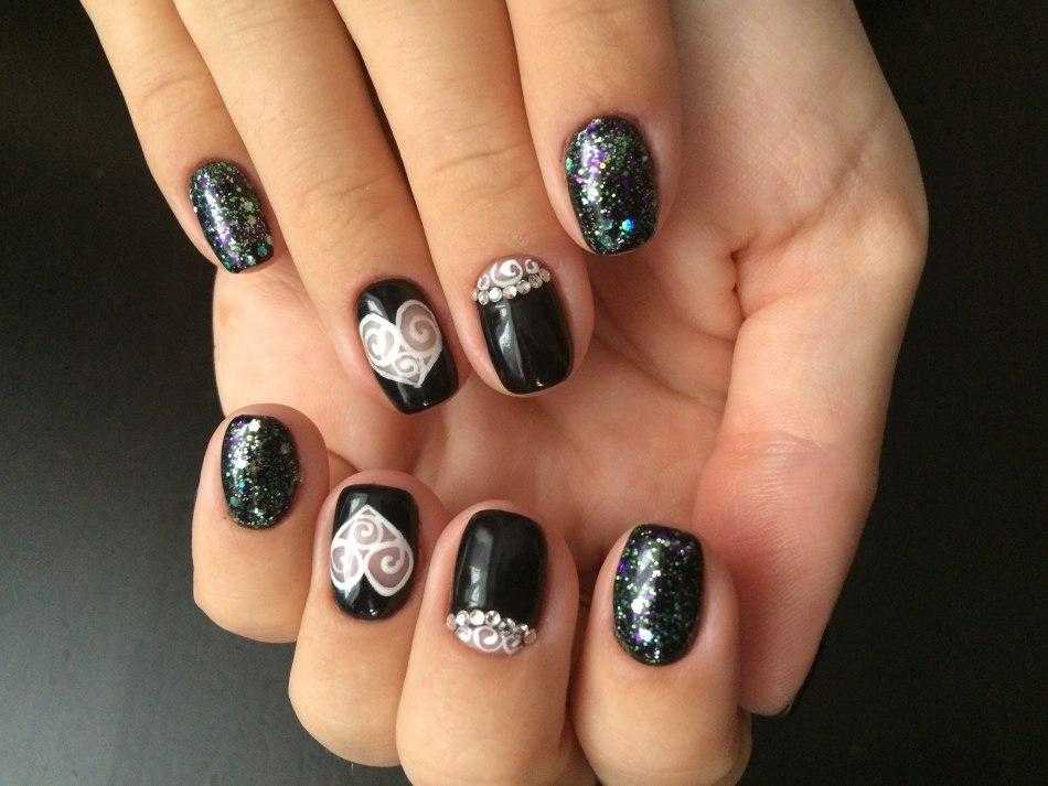 - Монохром с сердечками смотрится стильно. Таким дизайном вы украсите любой образ: и праздничный, и деловой. Но сердца должны быть очень четкими и сильно контрастировать. Для этого можно воспользоваться трафаретами, если у вас не получается их нарисовать ровно. Не забудьте про прозрачный глянцевый лак в качестве финишного покрытия.