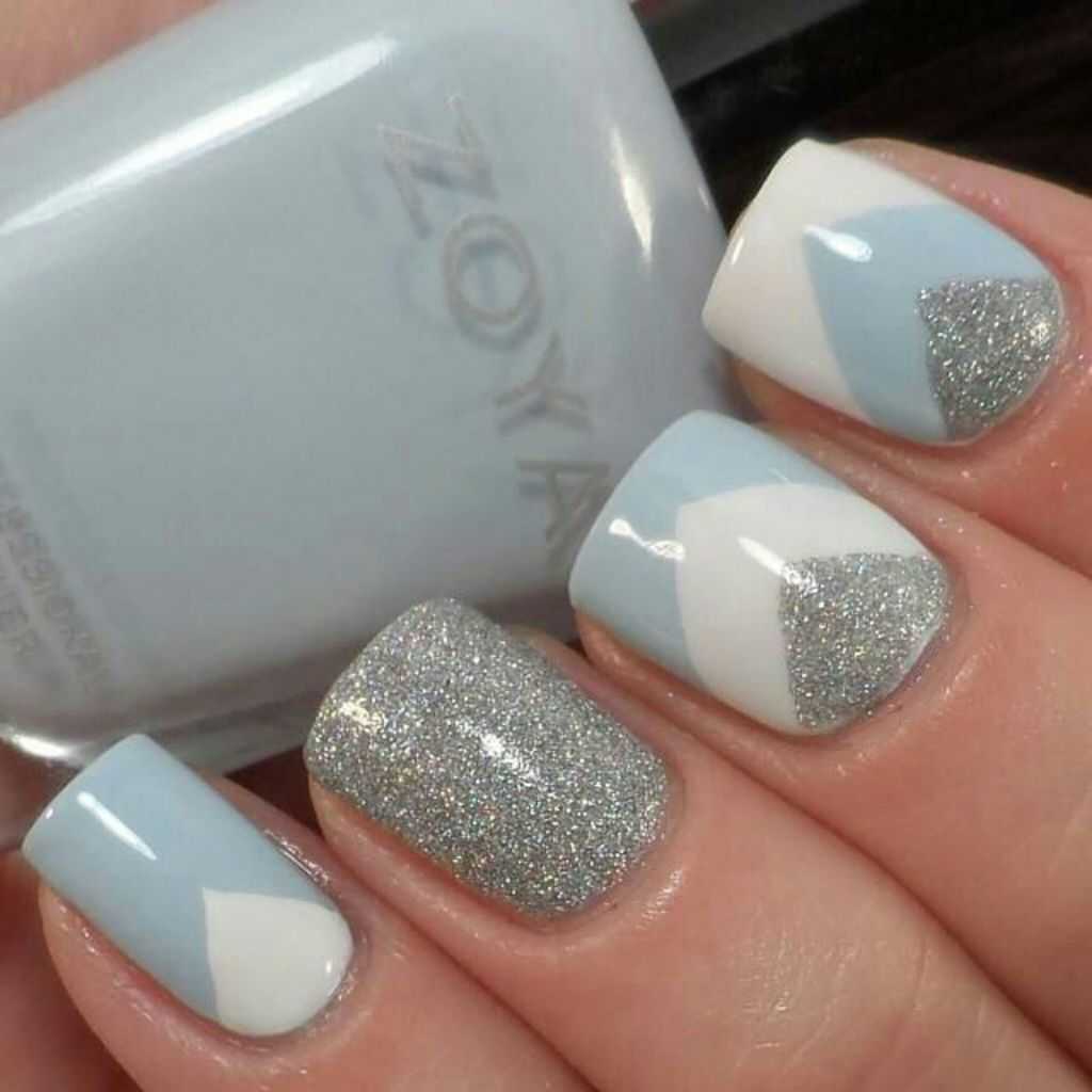 Зимой прекрасно смотрятся холодные оттенки с блестящими дизайнами. Придать теплоты и уюта можно с помощью вязаного маникюра. Чтобы его выполнить вам нужно нарисовать узор поверх топа и перед сушкой посыпать его акриловой пудрой.