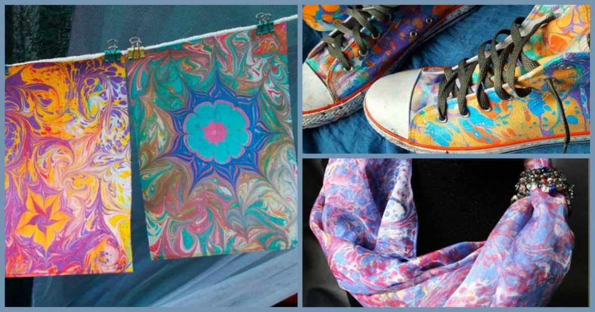 Картины в технике эбру можно увидеть в дизайне помещений, на одежде и аксессуарах.