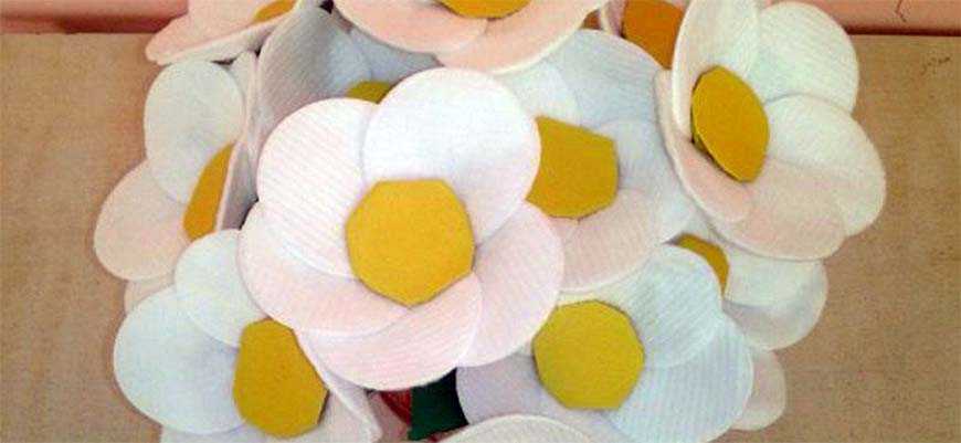 - Диски вымачиваются в крахмале и просушиваются. Формируются изящные лепестки, путём подгибания краев ватной заготовки. Серединку вырезают из плотной материи или фетра желтого цвета и приклеивают по серединке.