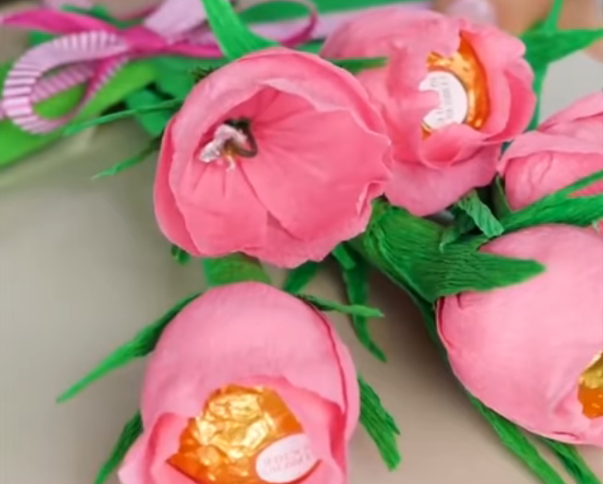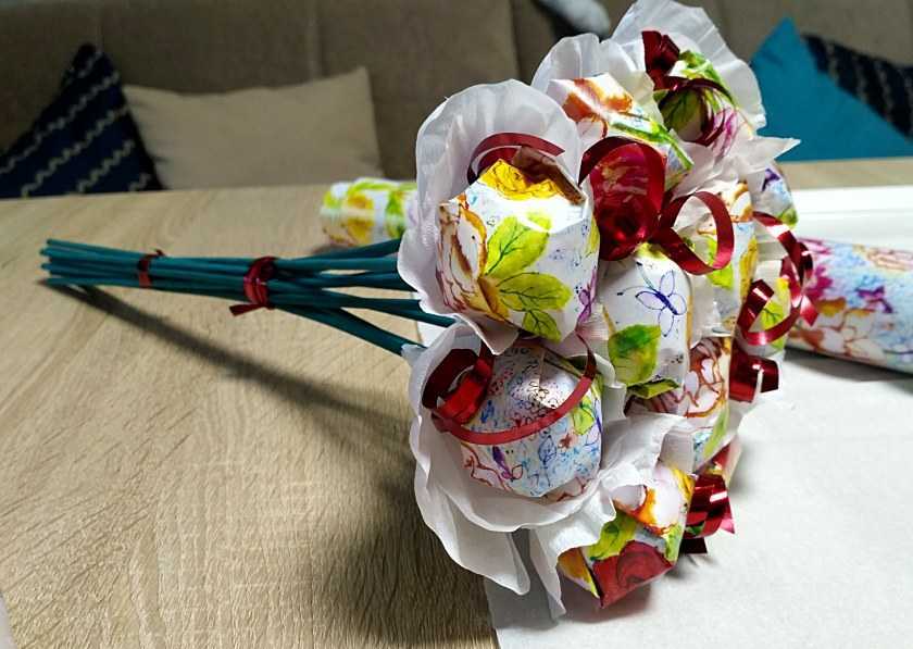 Конфеты закрепляются на шпажки или зубочистки, украшаются с помощью вырезанных из гофрированной бумаги лепестков, листьев, тычинок.