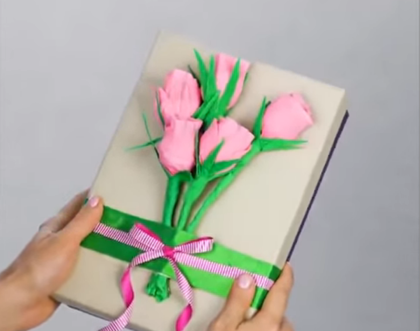Еще понадобиться гибкая проволока, оберточная бумага, живые или искусственные цветы и веточки зелени, миниатюрные игрушки. По шаблону, который вы можете скачать на сайте или выбрать из большого количества в интернете, вырезать лепестки и сформировать бутон.