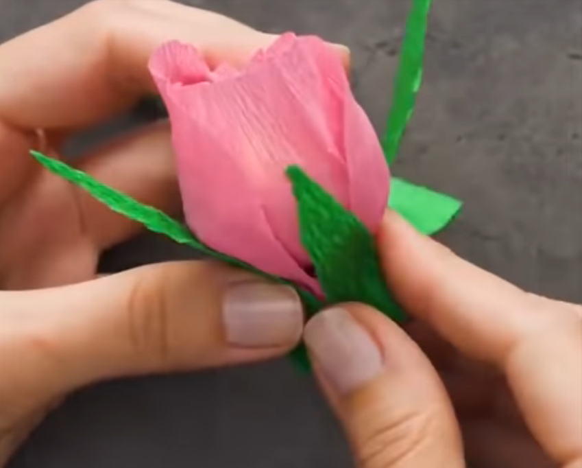 На розовые лепестки снизу бутона приклейте зеленую «травку». Из зеленой бумаги вырежьте тонкую полоску шириной примерно 1-1,5 см. Края полоски приклейте под бутоном. Оберните шпажку в полоску. Снизу приклейте.