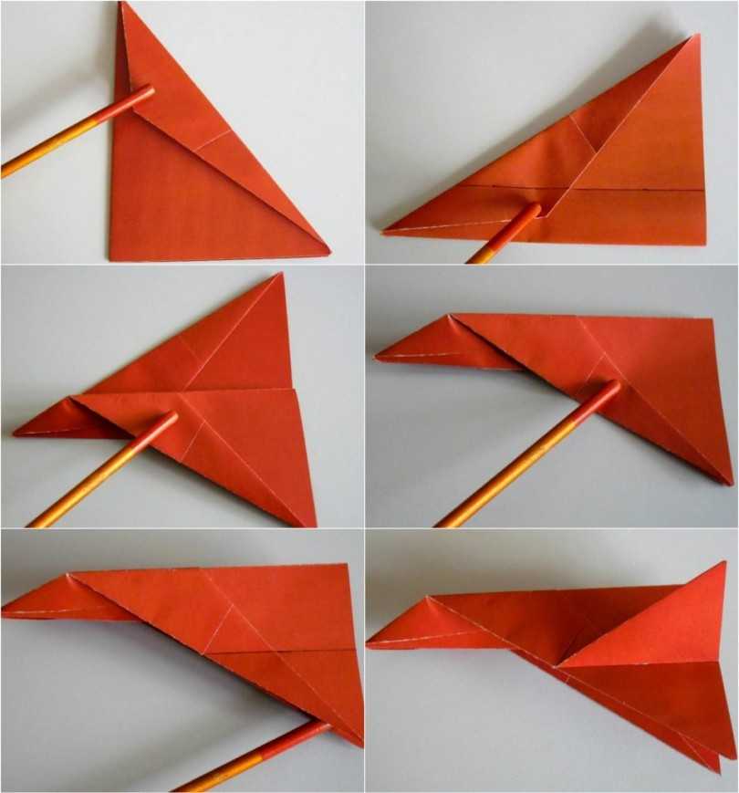8-10. Повторяем вышеописанные пункты для противоположной части листа. Загибаем носик и сгибаем самолетик пополам. При формировании крыльев нужно тщательно прогладить линию сгиба.