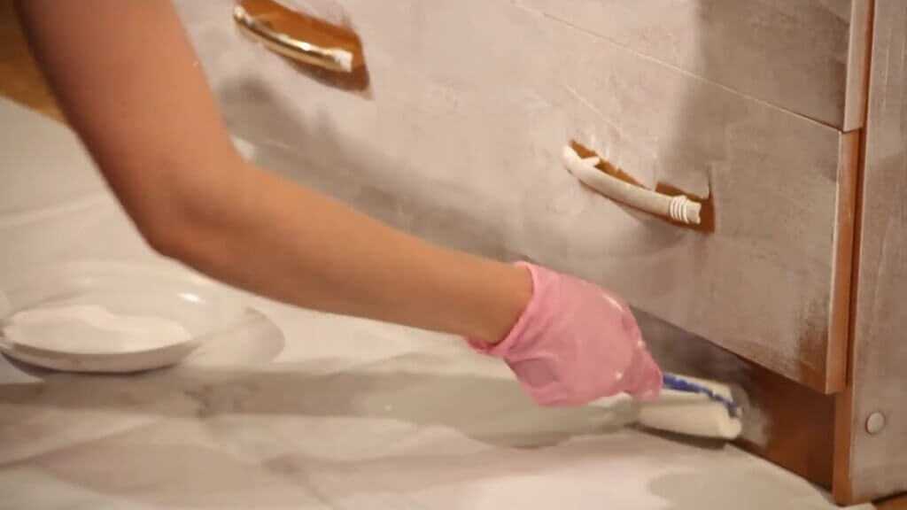 Комод покрывают краской, для чего необходимо воспользоваться валиком или кистью.