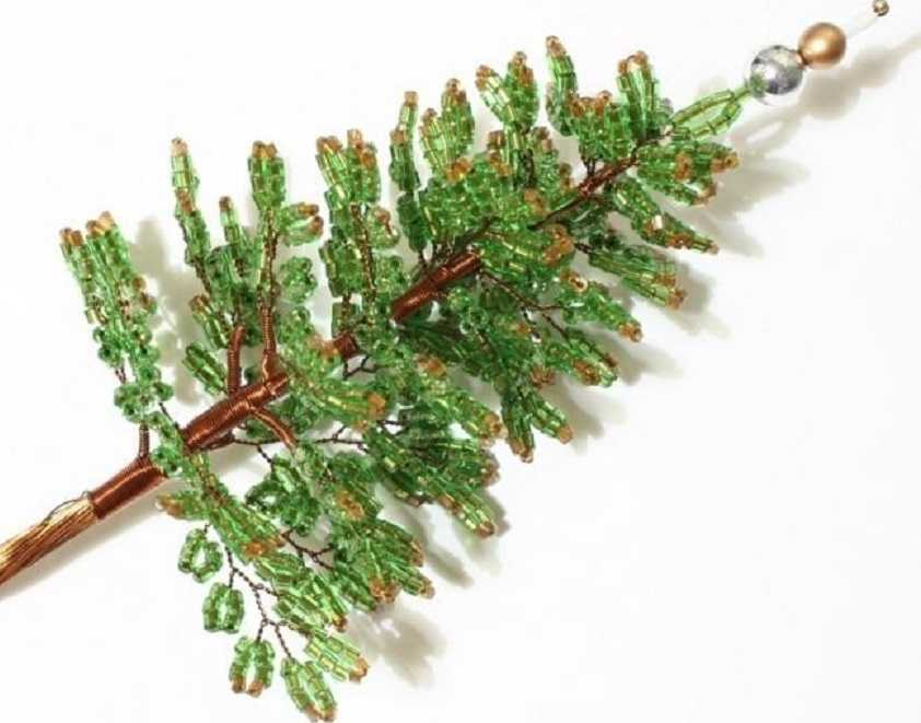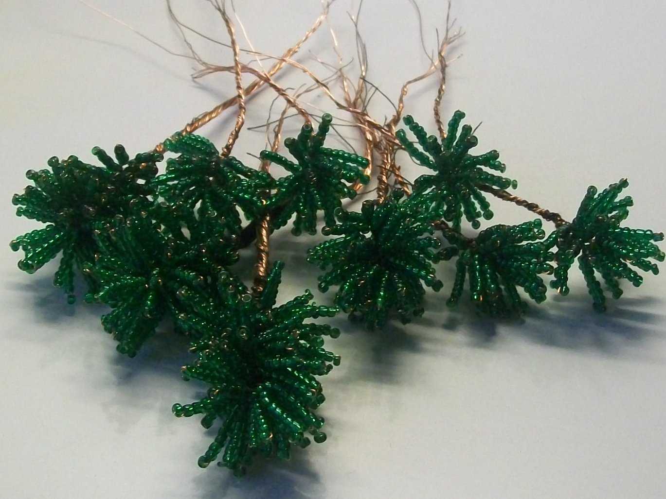 - Через белую бусинку пропустите проволоку. Снова повторите манипуляцию. На ветке должно быть 5-7 иголок