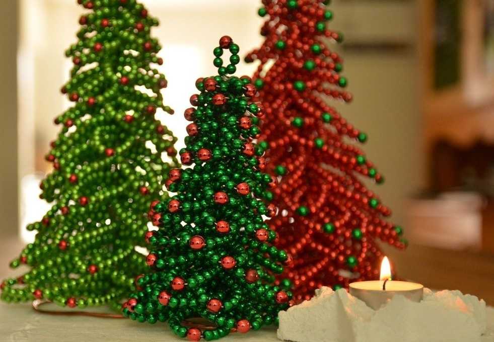 Для изготовления такой елочки вам понадобится проволока, белый и зеленый бисер и немного фантазии. Вам нужно сделать несколько веточек, которые потом скрепляются между собой.