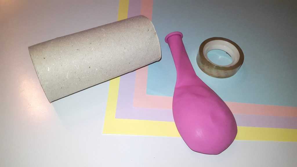 - Завяжите узел на воздушном шарике и отрежьте кончик. Теперь плотно натяните отрезанную часть на втулку от туалетной бумаги, как это показано на картинке.