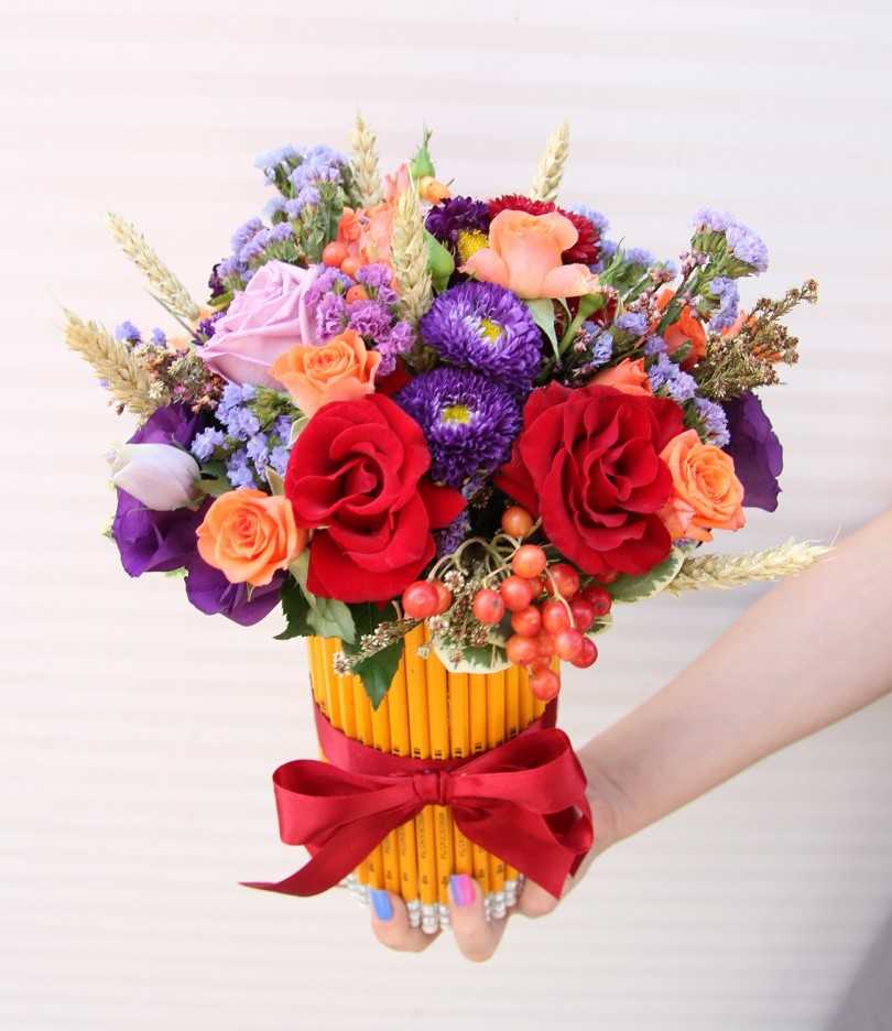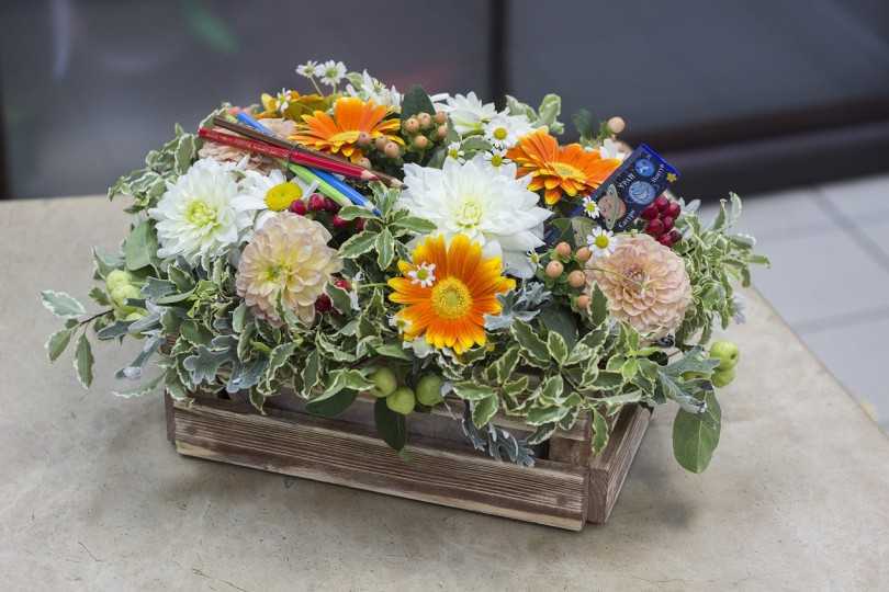 Необычные цветы со сладостями и игрушками – хороший презент на первое сентября учителю.