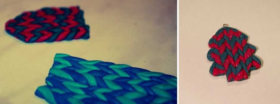 По тем же трафаретам Ира предложила нарезать еще и «вязаных» игрушек. Я лепила глиняную пряжу, а Женя тут же сплетала ее в двухцветные косички, которые потом склеиваются друг с другом и образуют рельефное полотно.