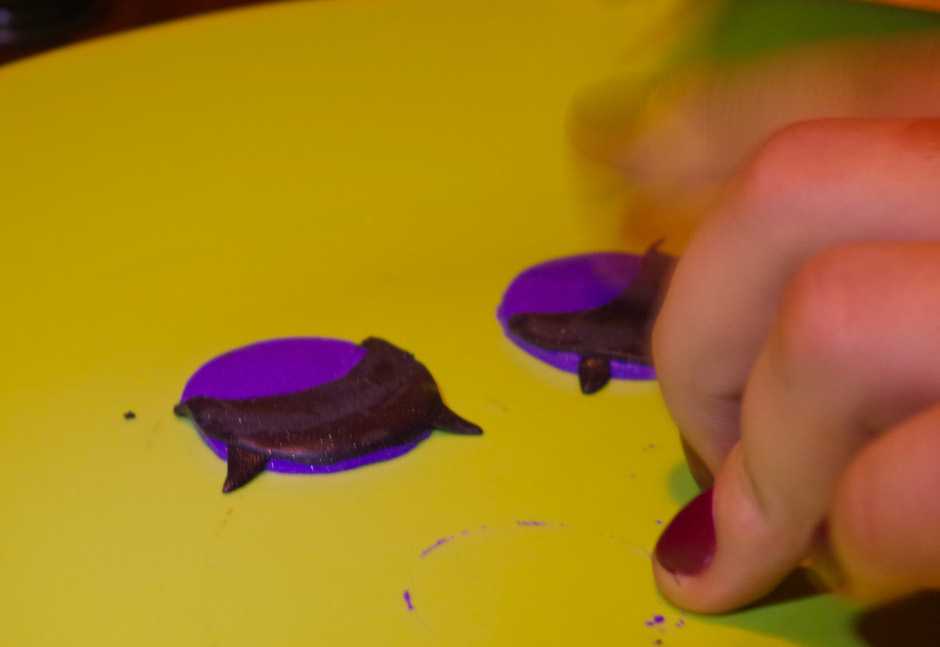 В изготовлении следующих игрушек нам тоже помогали шаблоны. Не нужно быть скульптором и даже не нужно иметь хороший глазомер, чтобы лепить круглых зверят, похожих на мультяшных смешариков. Чтобы делать ровные окружности, мы пользовались обычной рюмкой (было похоже, будто мы лепим пельмени), ей же мы раскатывали, как тесто, глину, из которой потом и вырезались детальки.