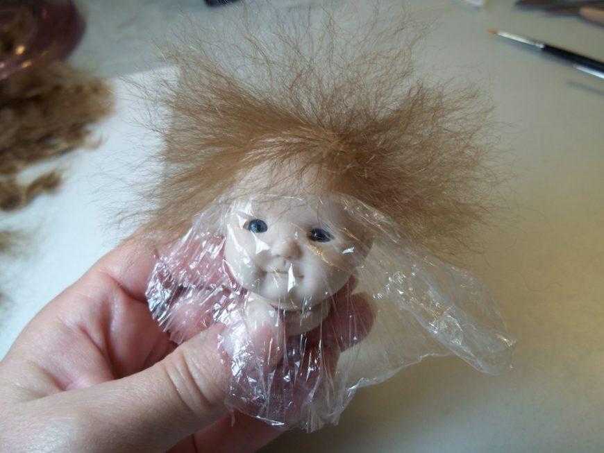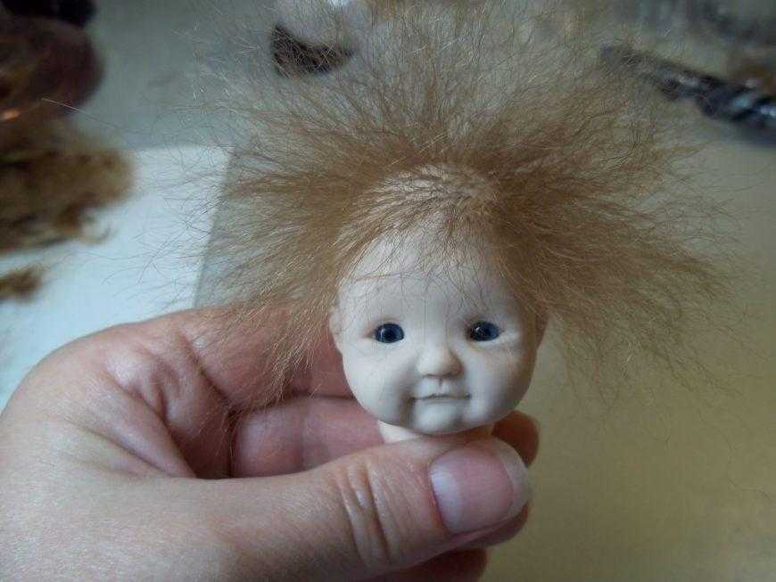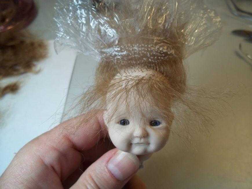 Можно приклеивать получившиеся волосы. Для кукол, изготовленных из тканей, можно использовать клеевой пистолет, а вот для пластмассы применяется только универсальный клей. Клея наносится немного, этого будет достаточно.
