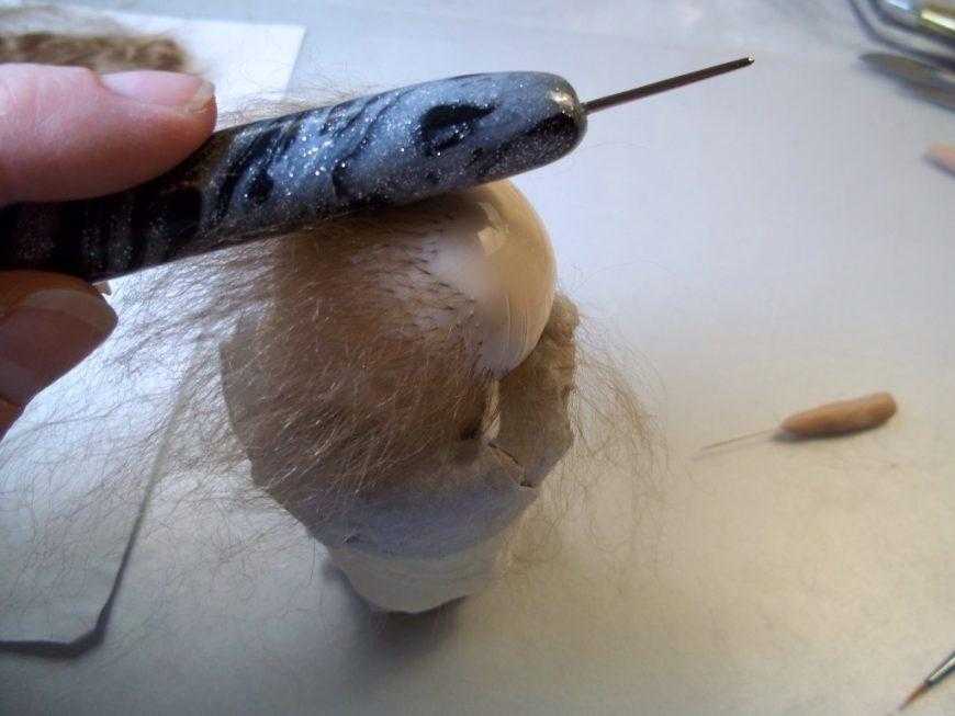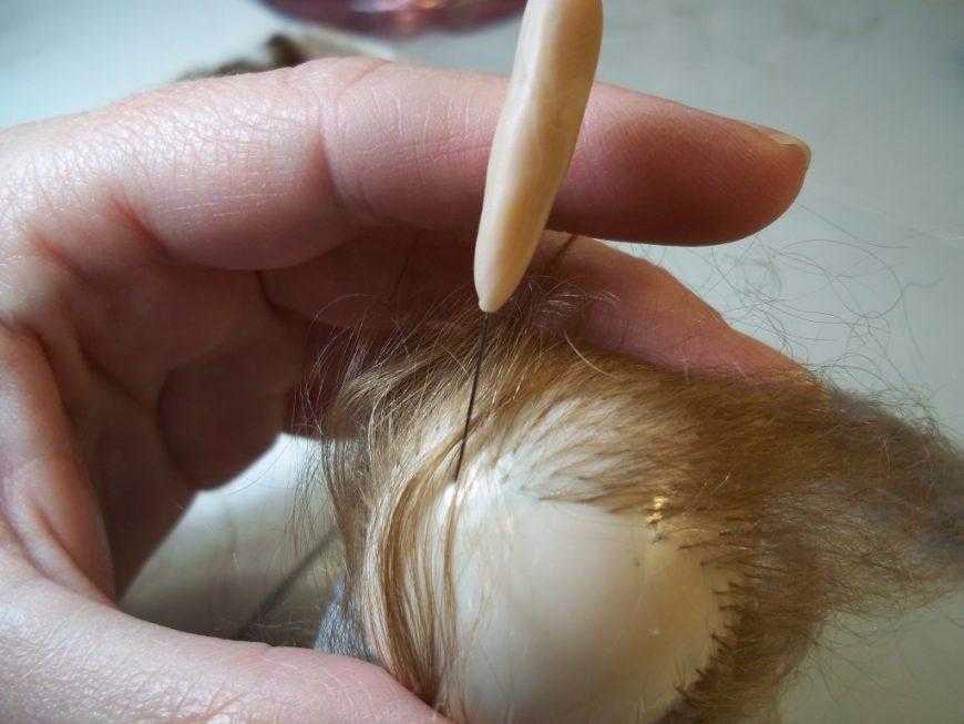 Чтобы волосы были гуще, старайтесь протыкать иголкой в каждой дырочке, чтобы в каждом отверстии был свой волос.