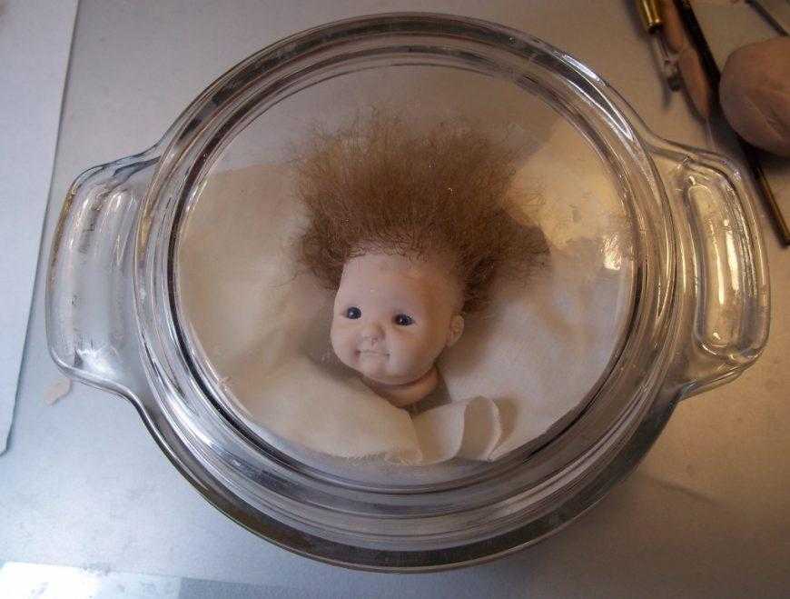 Перед началом нужно чем-то плотно обернуть куклу и закрыть ей лицо пищевой пленкой. Это надо сделать для того, чтобы вода не залилась внутрь игрушки. Конечно, если чуть-чуть воды все же попадет внутрь, не страшно. Ее можно легко удалить, тем более что сейчас почти все куклы разбираются.