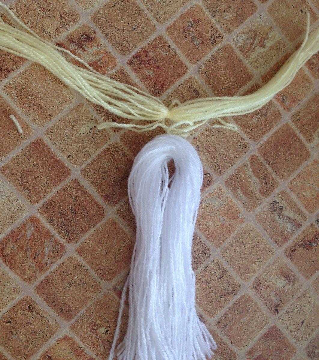 Возьмите рыболовную нить, отрежьте верёвочки нужной длины. Вставьте первую нить в английскую иголку и начинайте протыкать ею голову куклы снизу. При этом выводите острие иглы вверх в уже имеющиеся отверстия.