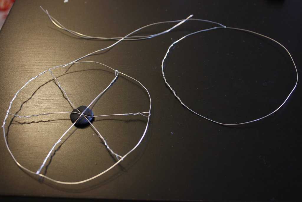 - Из проволоки делают кольцо диаметром 5 см и 3 см. Спицы изготавливают из отрезков 7см и 5см. В центре кладут таблетку из пластилина 0,5 см. На нее поверх поочередно укладывают проволоку с расстоянием по контуру круга 1,5-2 см. На концах ее пропускают через кольцо и скручивают, чтобы укрепить.