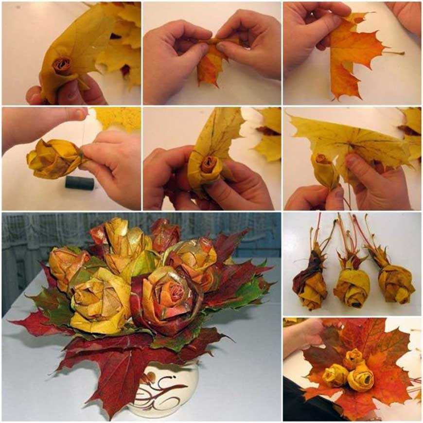 Букет — самое простое, что можно сделать из листьев, с него и стоит начинать, если ребёнок ранее не занимался подобными поделками. Для изготовления поделки в виде домашнего букета не обязательно использовать настоящие цветы, засушивать их и т. д. Бутоны можно изготовить из разноцветных листьев, собранных на прогулке. Подключите детей к каждому этапу процесса, создав настоящую творческую мастерскую.