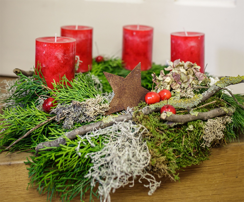 Использовать можно высушенные листья и цветы, траву, ветки, колосья и пр. Начинать рекомендуется с простых вещей. Пример – костёр из жёлто-красного листа заострённой формы и перекрещенных веточек. Создаётся такая история легко – справится с ней по силам даже начинающей мастерице.