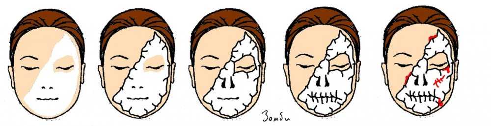 1) По диагонали делим лицо на две части. Накладываем белую основу на одну из частей, закрашивая нос и рот.