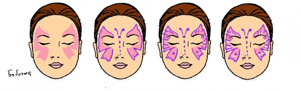 Рисунки аквагримом на лице и на теле наносятся с применением художественной схемы, которую можно найти в Интернете или разработать самостоятельно.