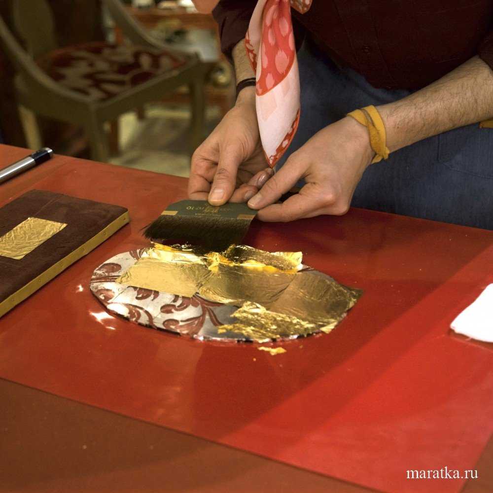 5) Накладываем на зеркало сусальные золотые листы таким же образом, как и серебряные.