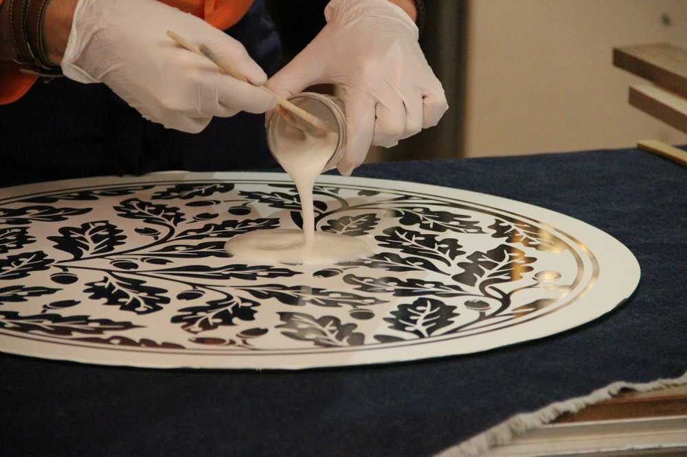 Второй шаг. На трафарет аккуратно кистью нанести травильную пасту и равномерно распределить ее. Оставить на десять минут, потом снять излишки той же кистью (можно отправить обратно в банку, паста своих свойств не потеряет). Еще через десять минут смыть остальную пасту и удалить трафарет. Гравировка готова.
