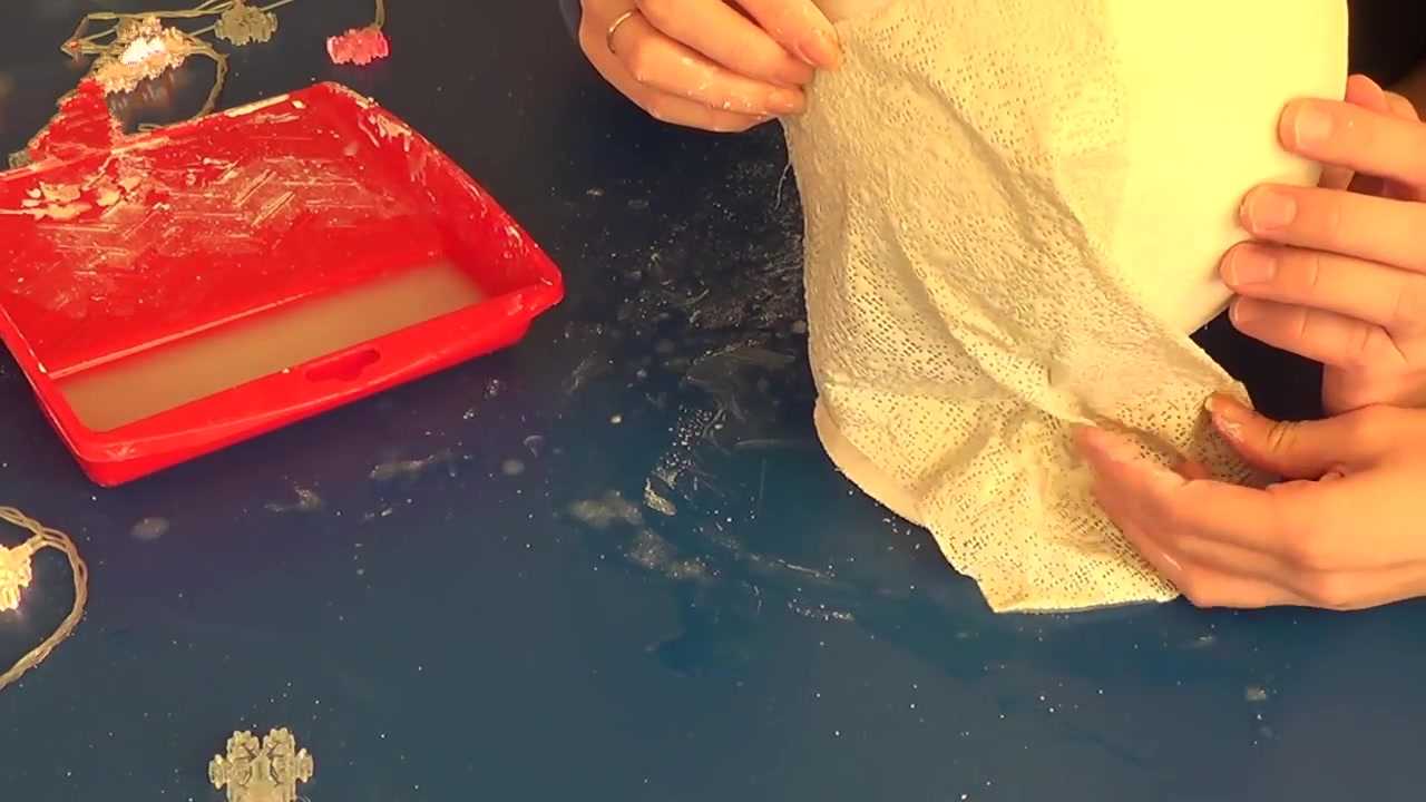 2. Смачиваем бинт в воде и начинаем наклеивать на шарик.
