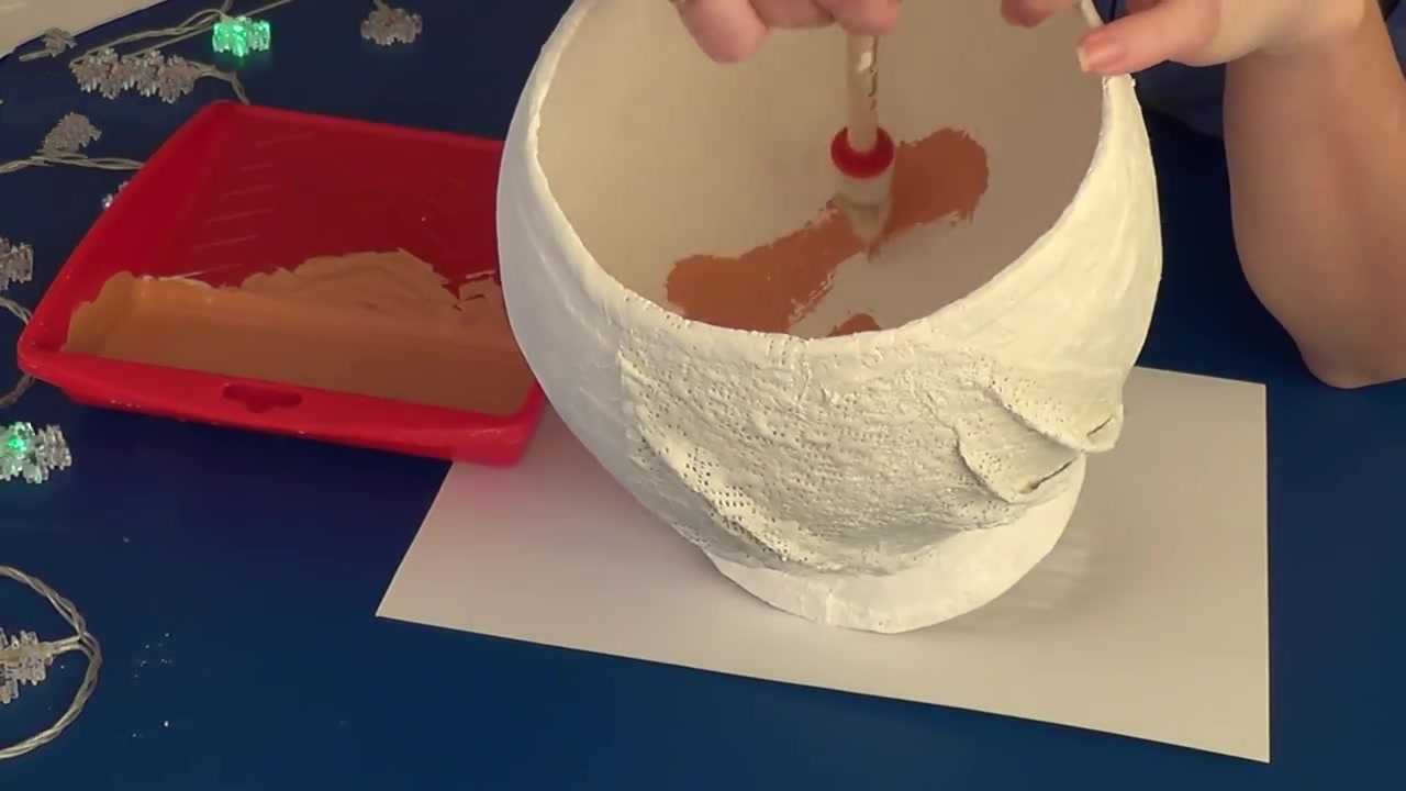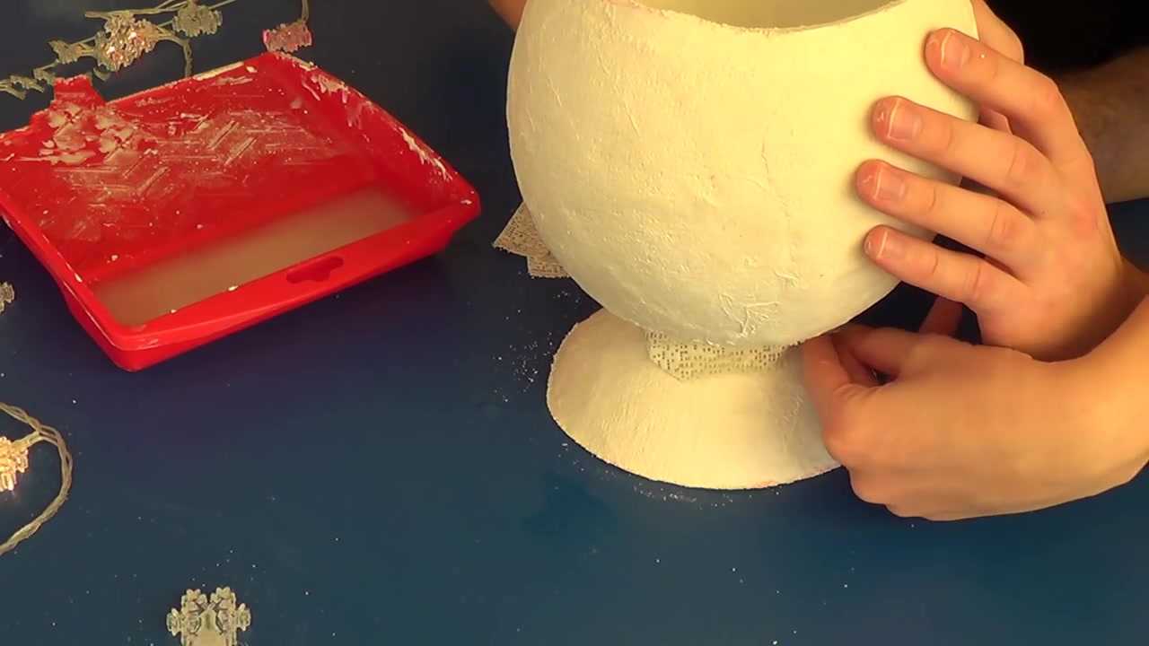 Верхнюю часть вазы формируем таким же способом — слой бинта, шпатлевка, еще слой бинта и слой шпатлевки. Чтобы ваза получилось прочной и устойчивой, можно сверху нанести еще несколько слоев шпатлевки, а после полного высыхания зашкурить наждачкой.