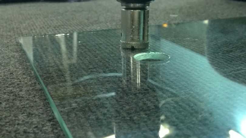 Здесь работа сложнее: сначала нужно сделать сквозной прокол в центре будущей дырки. В получившемся проколе закрепите проволоку, к одному концу которой прикрепите стеклорез. Если инструмент идёт плавно, можно спокойно резать.