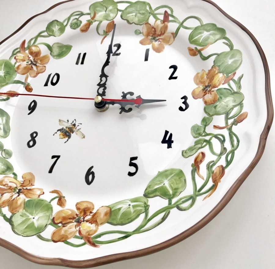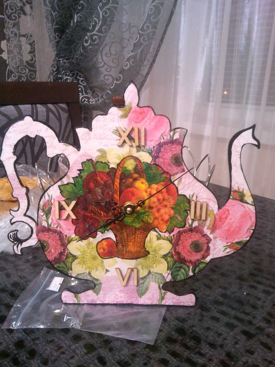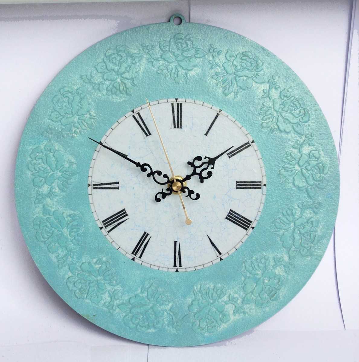 В технике точечной росписи наносится рисунок, с последующим покрытием лаком. Также можно сделать такие часы в смешанной технике. Середину часов расписать, а по краям применить декор, выполненный из шпатлевки при помощи мастихина. Такой вариант будет смотреться необычно и современно.