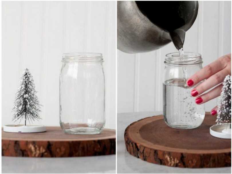 На крышку банки необходимо приклеить все декоративные элементы – фигурку Деда Мороза, окруженного снегом из пенопласта, снеговика, еловую веточку – на что хватит фантазии. Затем нужно наполнить баночку глицерином с водой в соотношении 1:1.