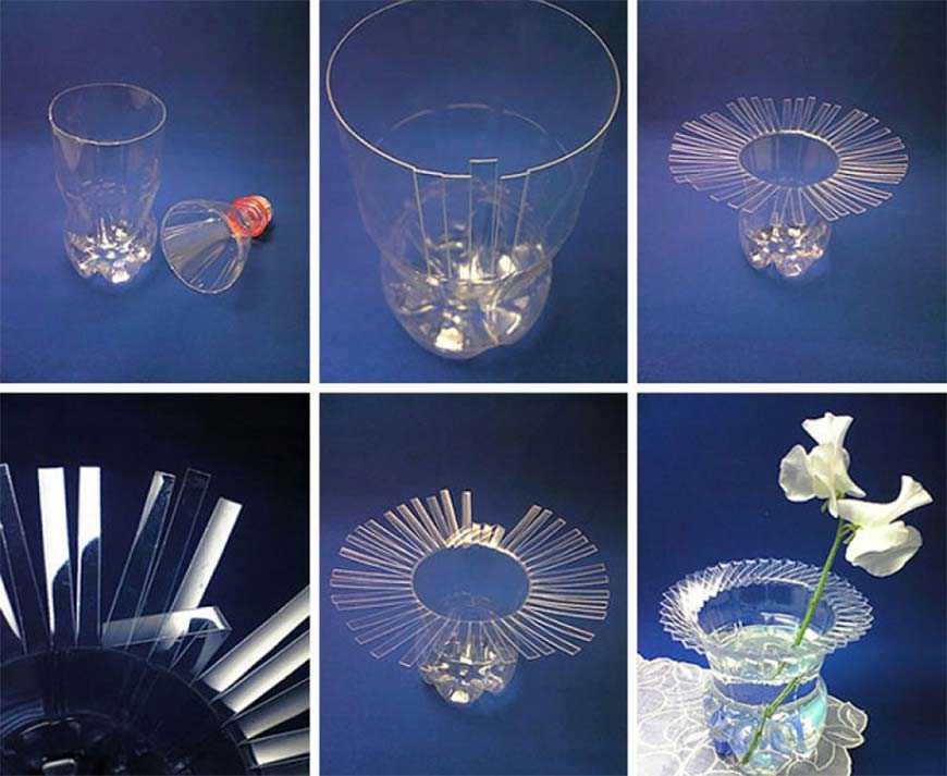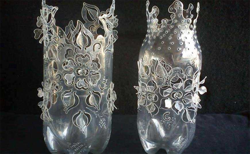 Для размещения самодельного букета понадобится подходящий сосуд, просто отрезать часть бутылки – не эстетично. Края среза размечают по линейке, чтобы сделать нарезку, закрепив результат нагреванием загибов. Небольшую прозрачную бутылку срезают под самый верх, у большой емкости срезают около половины. Выбираем материал с рифлением или «талией» посередине, чтобы была интересная основа.