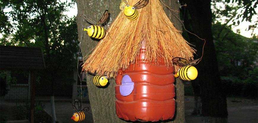 С помощью пластиковых бутылок можно отпугивать вредителей или привлекать птиц на участок. Для этого бак используют в качестве кормушки, а у корней плодовых деревьев размещают ловушки из бутылок с химикатами. Из двойной пластиковой ёмкости умельцы сооружают ловушки для ос, куда они влетают на сладкую воду и не могут выбраться обратно.