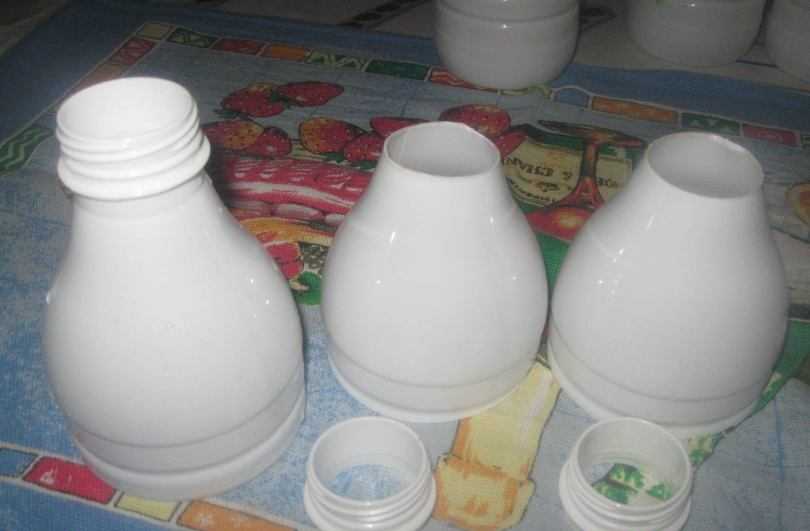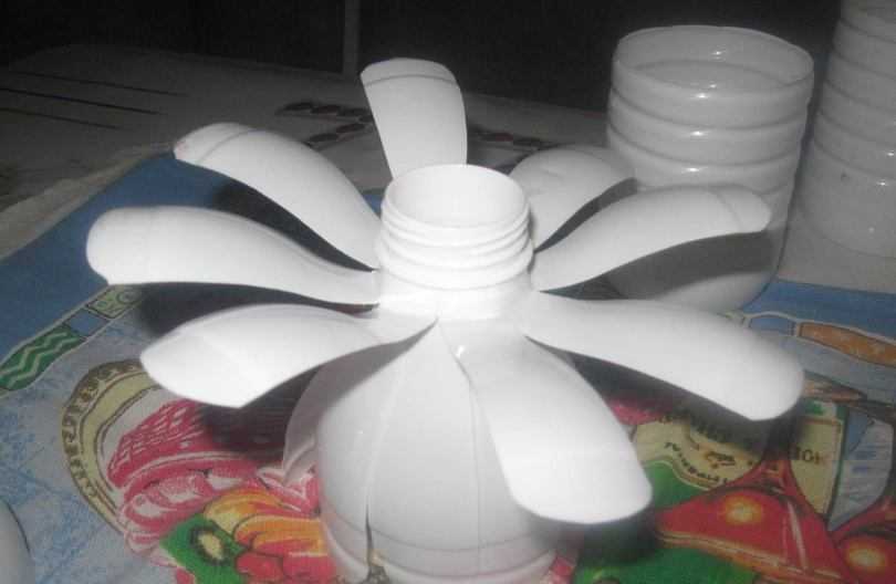 Дальше края бутылки разделяют на равных 5 частей по числу лепестков. Из пяти частей вырезают продолговатые лепестки. У белой бутылки с нарезанными белыми лепестками аккуратно отрезают горлышко, не дорезая 3,5 см до лепестков.