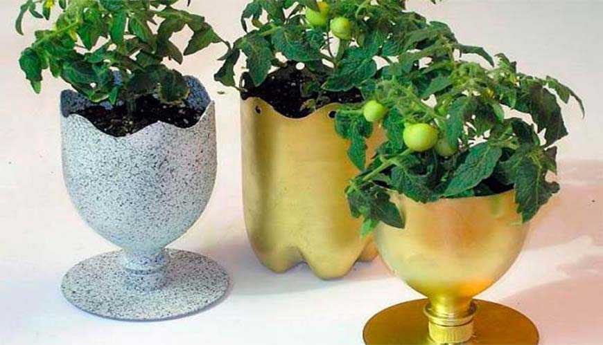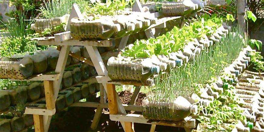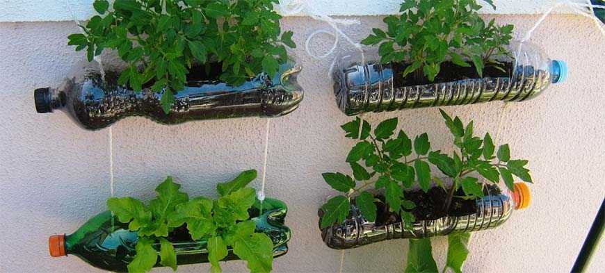 Разрезанные пополам большие бутылки и баки подвешивают и донцем вниз, и крышкой. На дно рекомендуется уложить крупную гальку для дренажа. Избыток воды после полива уйдет к растениям в нижних рядах. В таких же ёмкостях выращивают растения без грунта – гидропонным способом с добавлением удобрений. Свежую зелень и рассаду (в городских и дачных условиях) тоже проращивают в подготовленных пластиковых бутылках.