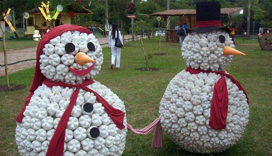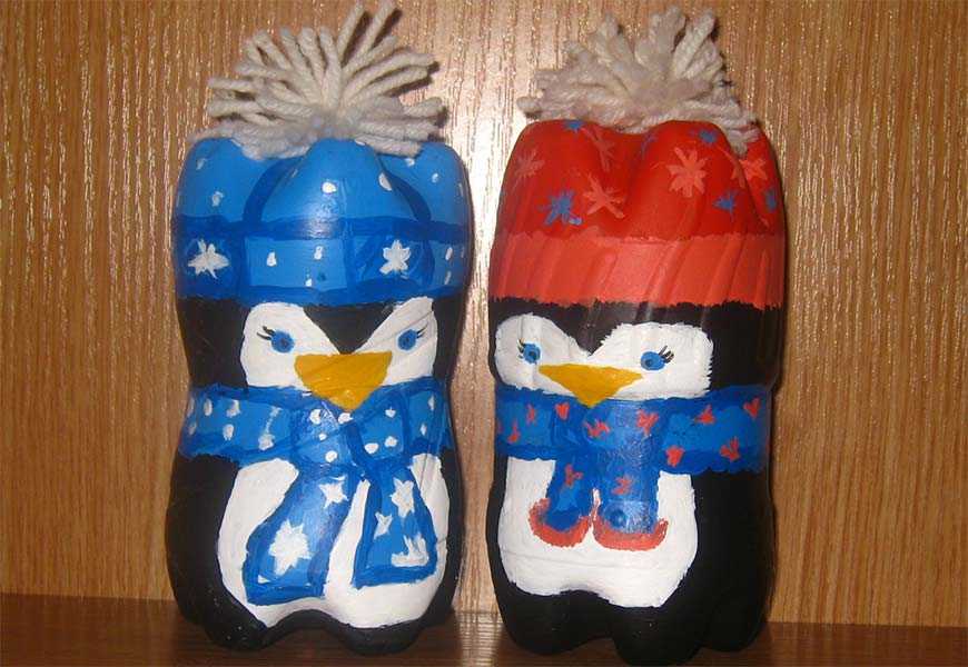 Новогодний декор из белых пластиковых бутылок «с талией» подойдет для снеговиков или пингвинов. Можно использовать черный лак для ногтей, чтобы прорисовать глазки и другие элементы, вату (снежок), блестки, мелкие пуговицы, бисер и всё, что под рукой. Забавные колпаки для персонажей – из цветных носков без пары, полоски трикотажа используют как шарфик.